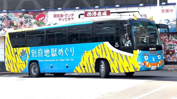 ⦅地獄めぐり⦆用の観光客向け遊覧バス=「亀の井バス」は古くより存在しますが、日本で初めて「バスガイド」なるものを導入したバス会社としても知られ、バスガイド第1号たる故《村上 アヤメ》さん( ➔〖Wikipedia〗)の有名な “七五調” の案内は今でも受け継がれ、要所要所にて観光客の耳を楽しませてくれています。