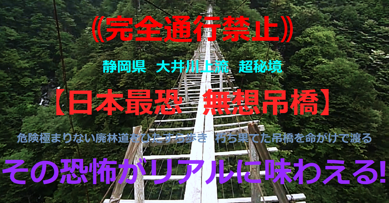 本記事は、秘境「寸又峡温泉」よりさらに奥の奥の大秘境、“普通の人間” ならば、まず行かぬ、行けぬ、大井川の支流寸又川の支流「逆河内(さかさこうち)なる深い谷の遥か上空に ぶら~~~ん と朽ち果てながら架かっている(たぶんまだ…)、いつぞやのバラエティー番組でも『日本一怖い』と取り上げられたことがあるらしい恐怖の吊り橋、【無想吊橋(むそうつりばし)をご紹介させて頂くものです。