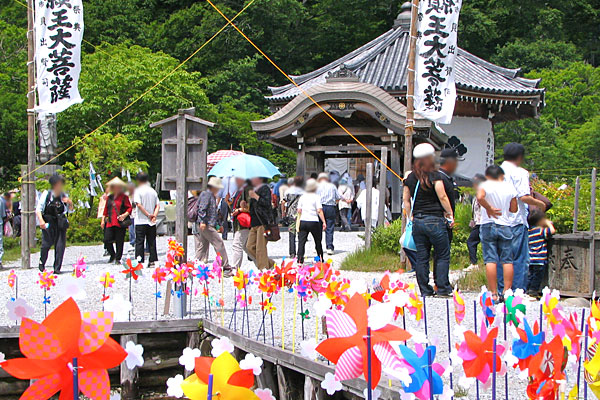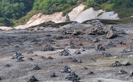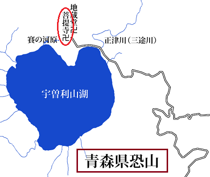 寺院周辺には「三途川(さんずがわ)」・「賽の河原(さいのかわら)」・「極楽浜」などと呼ばれる川や砂浜などもあり、その名にふさわしい風景のそこは “死者の魂が最も集まる場所” だともされ、「口寄せ(くちよせ)」と呼ばれるそうした霊魂への質問や霊魂からのメッセージを聞き伝える「イタコ」と呼ばれる女性たちの総本山的な地としても有名です。(下画像参照)